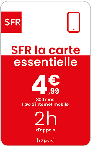 Conditions of use: Offer subject to conditions, valid in mainland France, for a period of 30 days from its activation and reserved for SFR La Carte customers who already hold an SFR La Carte SIM card. For personal, non-profit use only. Details at point of sale or on sfr.fr.