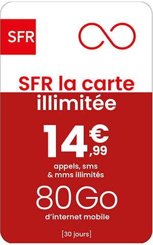 SMS/MMS illimités : métropolitains et limités à 200 destinataires différents pendant la durée de validité de l’offre (hors SMS/MMS surtaxés, Chat et Wap). Offre soumise à conditions, valable en France métropolitaine, pour une durée de 30 jours à compter de son activation et réservée aux clients SFR La Carte déjà détenteurs d’une carte SIM SFR La Carte. Pour un usage uniquement personnel et non lucratif. Détails en point de vente ou sur sfr.fr.