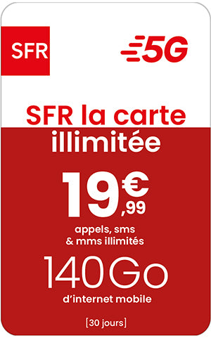 Offre soumise à conditions, valable en France métropolitaine, pour une durée de 30 jours à compter de son activation et réservée aux clients SFR La Carte déjà détenteurs d’une carte SIM SFR La Carte. Pour un usage uniquement personnel et non lucratif. Détails en point de vente ou sur sfr.fr.