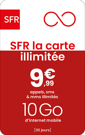 Offre soumise à conditions, valable en France métropolitaine, pour une durée de 30 jours à compter de son activation et réservée aux clients SFR La Carte déjà détenteurs d’une carte SIM SFR La Carte. Pour un usage uniquement personnel et non lucratif. Détails en point de vente ou sur sfr.fr. Internet Mobile 10 Go en France métropolitaine, accès internet bloqué au-delà du seuil autorisé. Durée de validité du crédit internet reportable avec une offre prépayée identique.